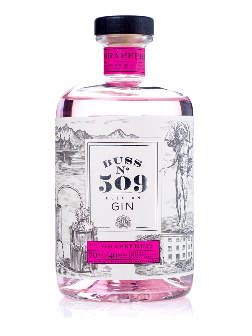 Buss N° 509 Pink Grapefruit Gin is de opvolger van de Buss N° 509 Raspberry gin gemaakt in Antwerpen door Serge Buss van Bar Bounce. De Buss N° 509 Pink Grapefruit wordt gemaakt van roze pompelmoezen die gedurende enkele uren worden gemacereerd en nadien worden geblend. De andere gebruikte botanicals zijn o.a.: jeneverbes, koriander, zoethout, angelica wortel, vanille, cardemom, iriswortel, sinaasappel en citroenschillen. Een heel fruitige gin, vol van smaak en perfect als aperitief door de licht bittere toets van de pompelmoes.